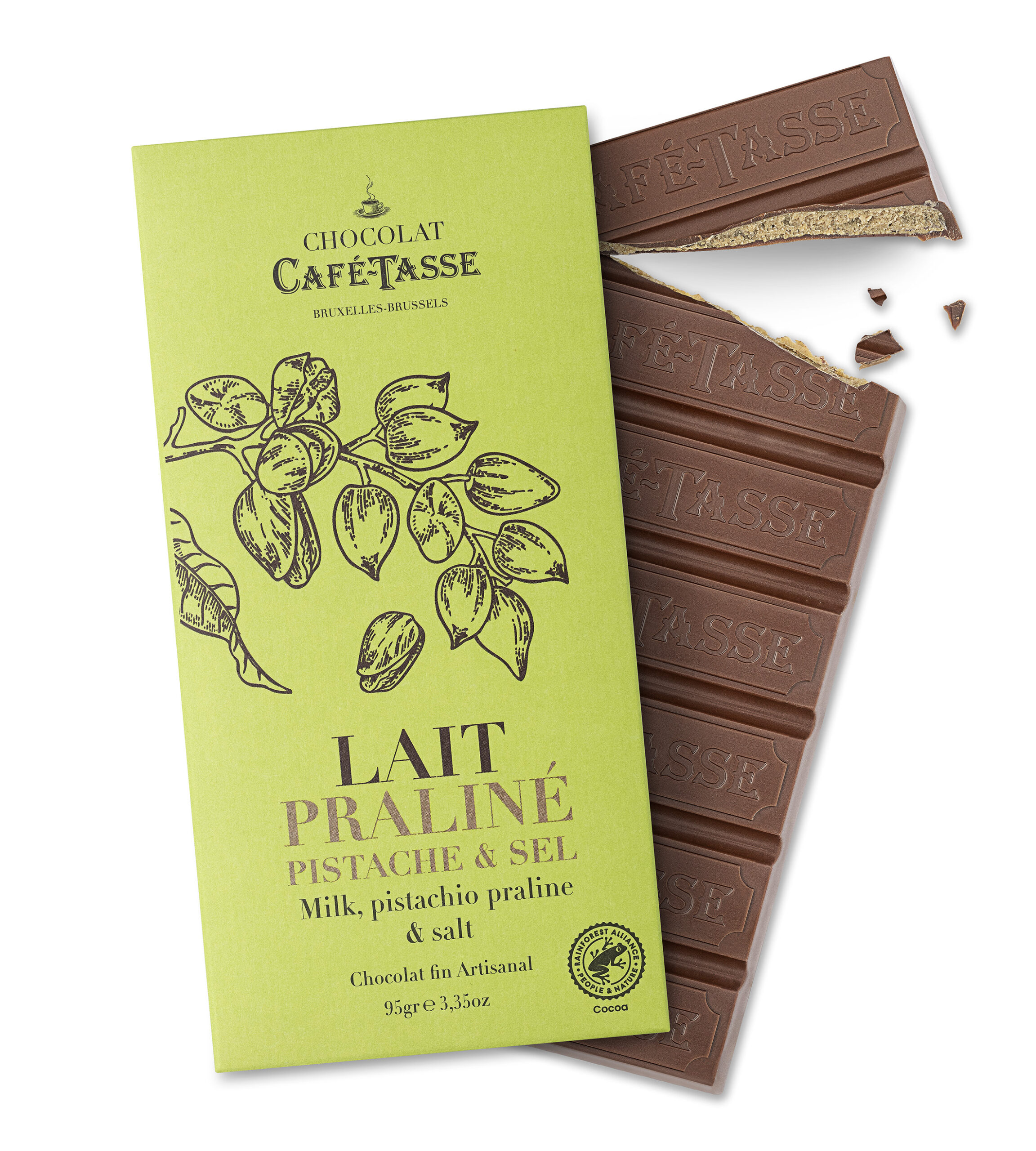 Découvrez une création d’exception avec la tablette chocolat au lait fourrée praliné pistache & fleur de sel 95g.
